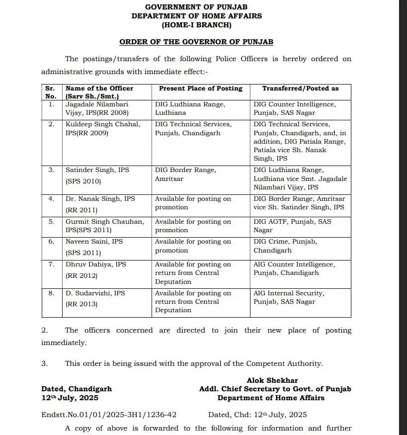 पंजाब पुलिस: पंजाब पुलिस में बड़ा फेरबदल किया गया है। कई अधिकारियों का तबादला किया गया है।