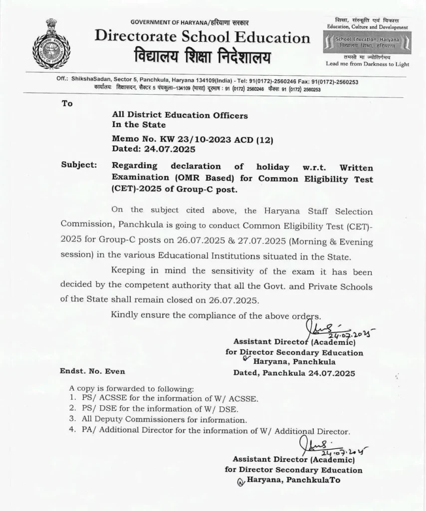 अधिसूचना में कहा गया है, “हरियाणा कर्मचारी चयन आयोग, पंचकूला, राज्य में स्थित विभिन्न शैक्षणिक संस्थानों में ग्रुप-सी पदों के लिए सामान्य पात्रता परीक्षा (सीईटी)-2025 का आयोजन 26.07.2025 और 27.07.2025 को (सुबह और शाम के सत्र में) करने जा रहा है। परीक्षा की संवेदनशीलता को ध्यान में रखते हुए, यह निर्णय लिया गया है कि राज्य के सभी सरकारी और निजी स्कूल 26.07.2025 को बंद रहेंगे।